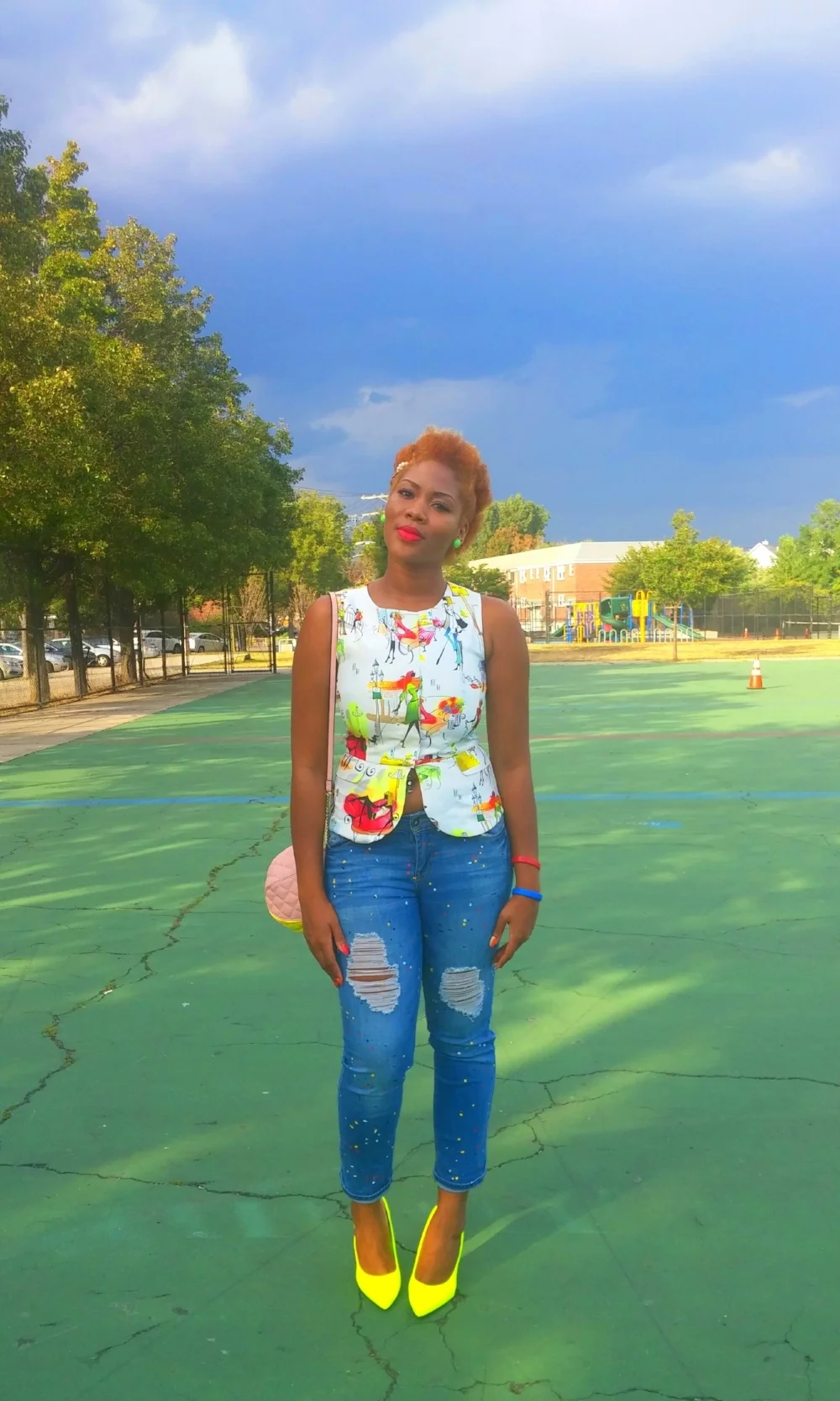 "Something about this top makes me wanna wear it with colors. It just brings out the fun side of me. The last time I wore it I paired it with a colorful skirt. This time I'm wearing it with a pair of ripped jeans splattered with different colors of paint. I swapped my pair of sandals for a pair of neon yellow pumps. Last time I had on neon green nail polish on my toes but this time I have on neon green earrings instead. Very summery right?"