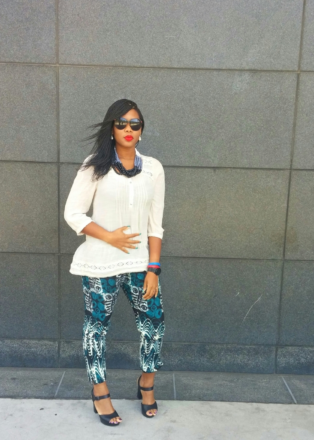 "This was one of those times I didn't feel like dressing up. I wanted to be comfortable. I wore my breezy cream cotton top, my green ankara pants and black sandals.