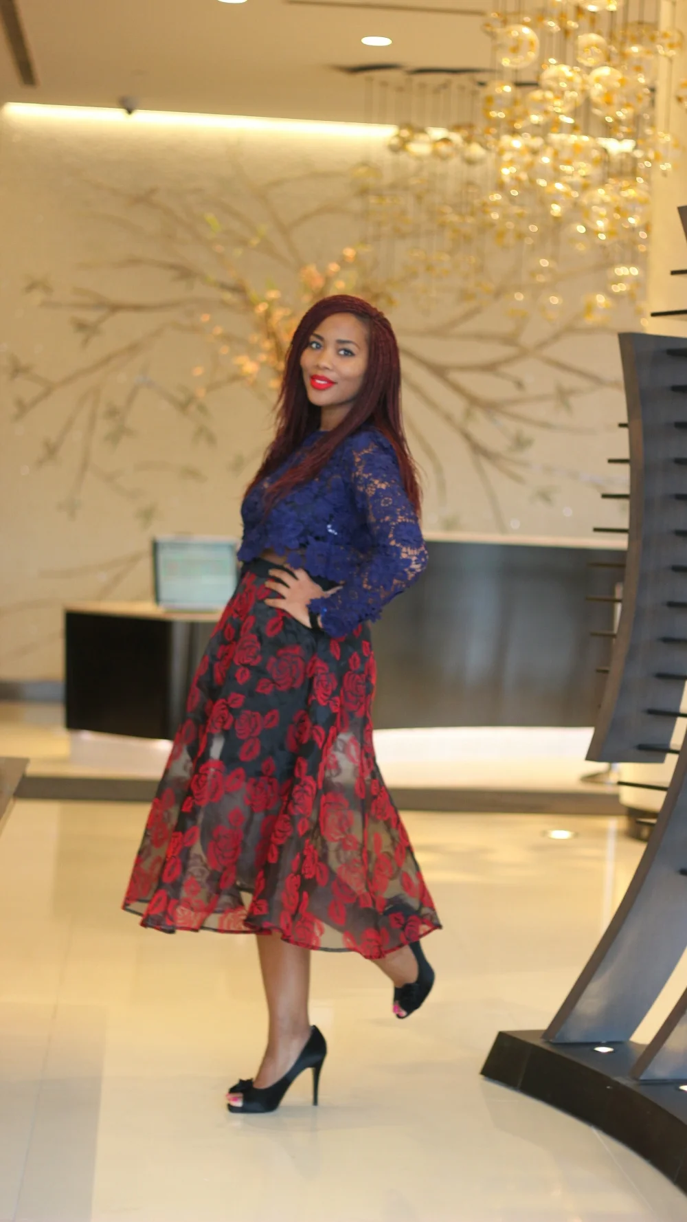 My rose petal skirt goes perfectly with my knitted flowered crop top. I love the navy blue and dark red contrast. I think that both are great colors for Winter.