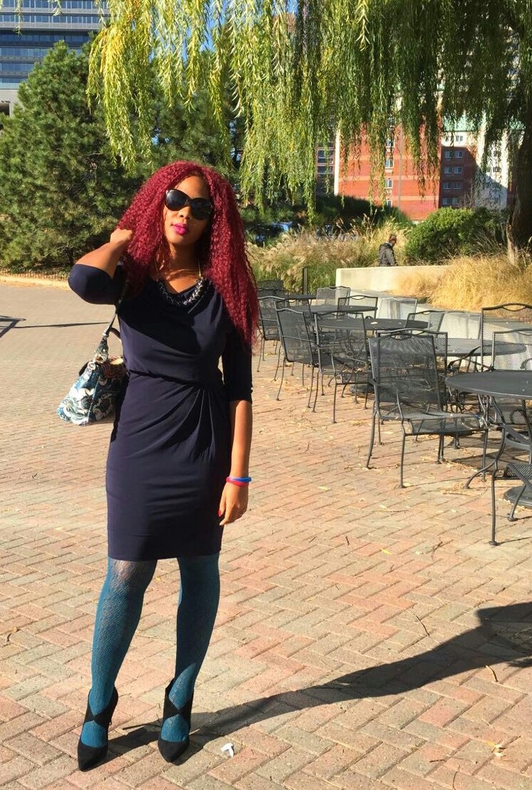 In spite of my haste, I knew I had to add some excitement to my look so I wore my blue fishnet tights and navy necklace. Everything else (my red jacket, and my purse) was a coincidence."