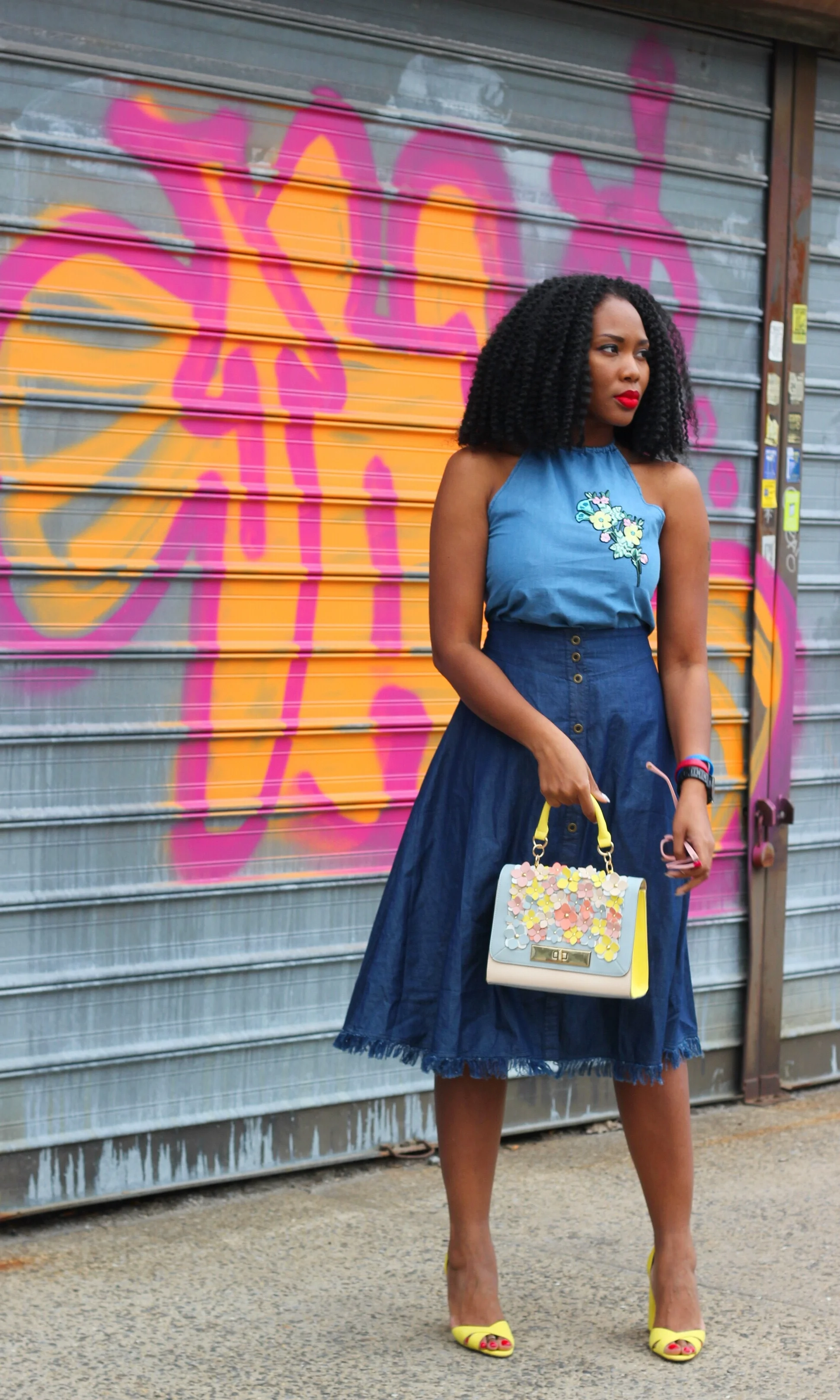 In today's post, I chose to wear a dark denim skirt because it flatters my full thighs.